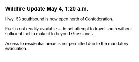 The only hospital in the city, Northern Lights Regional Health Centre, evacuated all 105 patients, the Alberta Government said.